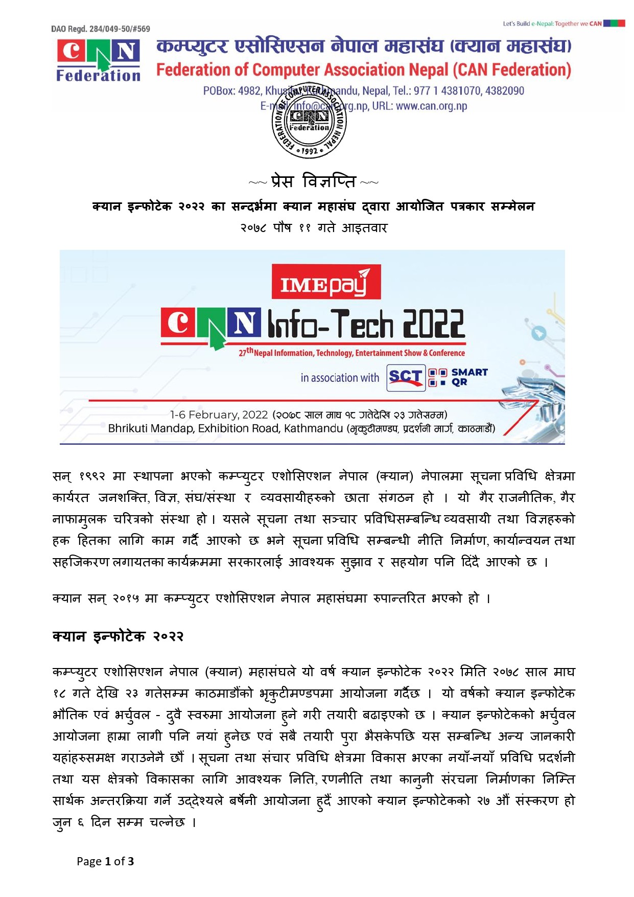 The 27th edition of IME Pay CAN Info Tech 2022 is being organized by Computer Association Federation of Nepal (CAN) from February 1 to 6 in Bhrikutimandap kathmandu. President of CAN Federation Nawaraj Kunwar informed at a press conference on Sunday that preparations for the infotech to be held at Bhrikuti Mandap in Kathmandu have been intensified. Covid will be infested with moderate health safety standards.